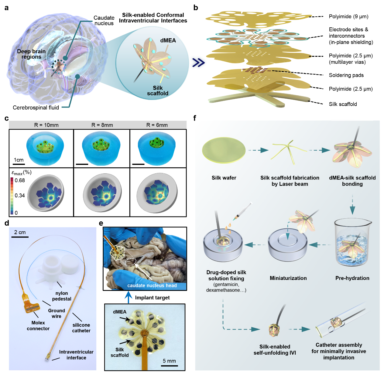 图1. 丝蛋白赋能微创植入式脑室内柔性神经界面总体概览:微创递送与自展开贴附示意、器件爆炸图、曲面适形有限元仿真与实物验证、系统实物、可变形微电极与丝蛋白支架,以及微创植入界面器件的集成。