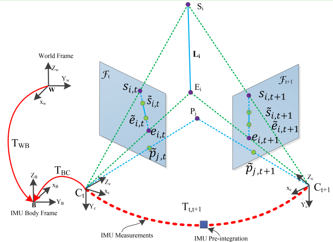 视觉-惯性SLAM系统实现了对摄像机运动和环境的三维表示的高度精确的估计。大多数现有方法依赖于特征匹配或使用光度一致性约束的直接图像配准来构建点云。当面对低纹理环境时,这些方法的性能通常会降低。本文提出了结合点和线特征的视觉-惯性SLAM系统的鲁棒性。该方法通过选择关键帧并处理异常值的方法,以一种有效的方式组合了点、线特征和IMU测量值。文中代价函数由点差、线重投影误差和IMU残差构成,并导出了线重投影误差的雅可比矩阵与线段的三维端点和摄像机运动的关系。环路闭环检测是由点和线特征决定的,使用的方法是词袋法。该方法在EuRoc数据集上进行了评估,并与最先进的视觉-惯性聚变方法进行了比较。实验结果表明,该方法对大多数测试序列具有较高的精度,特别是在低纹理和光照变化等具有挑战性的情况下。