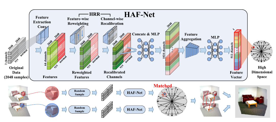 相较于二维图像特征,包含空间几何信息的3D特征在点云配准、场景三维重建、场景感知等应用中表现更加鲁棒和稳定。基于最近深度学习在图像特征表示方面取得的成功,团队研究人员同时考虑不同输入信息以及不同通道信息对3D特征的响应差异,提出了一种分层的注意力融合机制实现了对输入数据的高效特征提取。其次,网络还引入局部特征聚合模块以避免传统池化方式带来的信息损失,最终学习得到了一种能够用于高精度点云配准的3D特征描述子。实验证明,该特征描述子显著提高了三维场景重建中点云配准的精准度,尤其增强了大视角变换(视场覆盖率小)条件下点云配准算法的稳定性。