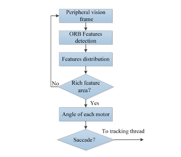 首次使用仿生双眼作为视觉传感器,提出了一种主动式的视觉SLAM系统,该系统受人眼中心视和周边视的启发,使用中心视的广角相机去探索环境中的特征丰富区域,使用saccade眼球运动快速切换到特征丰富的区域进行SLAM的位姿计算,实现了图形特征丰富区域的自主寻找和注视,使得本系统具有环境特征主动探索能力,与固定双目相比,在遇到弱纹理区域将主动的进行视野的切换,保证了特征的数量,不容易发生特征丢失现象,从而保障轨迹完整地输出,大幅提升了SLAM系统的复杂场景适用能力。