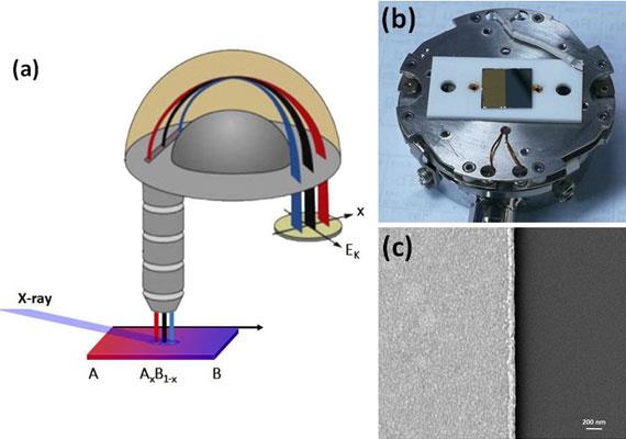(a) 二维光电子能谱分析器示意图. (b) 装有Au/Si样品的样品托. (c) Au/Si样品的扫描电镜图像,标尺是200nm。 -