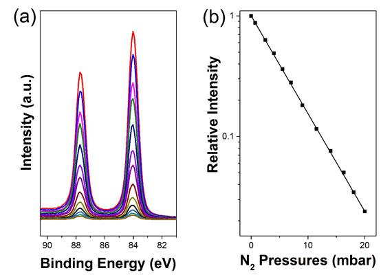 (a) 10-9到20 mbar条件下Au 4f 高分辨X射线光电子能谱图 (b) Au4f信号与N2气压的线性拟合曲线 -