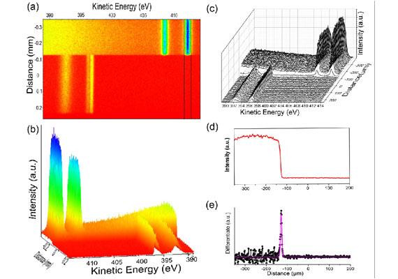 (a) Au/Si样品的动能与距离的关系图. (b) Au/Si样品的三维XPS图,包括动能,距离与信号强度. (c) 不同位置处的XPS图. (d) Au信号强度随位置的关系变化图. (e) 图谱拟合结果表明分辨率优于7.5μm