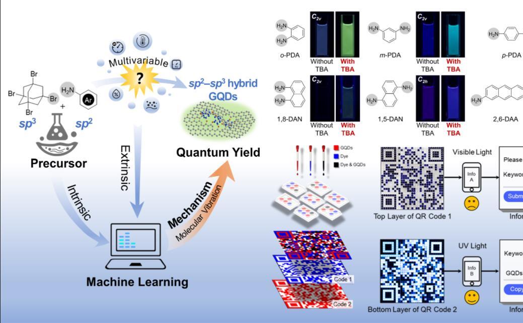 图2. 机器学习结果指导的高量子产率石墨烯量子点及荧光防伪加密应用演示