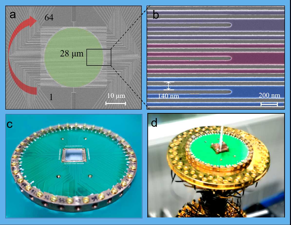 高速、光子可数分辨单光子探测技术在月地、火地等深空激光通信,高速量子密钥分发,光量子计算中具有重要应用前景。传统的单光子探测器,如雪崩光电二极管和光电倍增管,在效率、速度和时间分辨率等方面难以满足当前应用需求;超导转变沿传感器具有较好的光子数分辨能力和较高的探测效率,但具有较低的探测速度和较大的时间抖动,同时需要极低工作温度和复杂的读出制冷系统。近年来超导纳米线单光子探测器(SSPDs)因其高效率、低暗计数率和优异的时间分辨率,在量子通信、光学量子计算和量子力学原理验证等方面广泛应用。尽管传统的单元SSPD具有出色的性能,但由于其读出电路和探测器恢复时间限制,其探测速率(计数率)通常仅几十MHz。此外,单元SSPD的光子数分辨能力受到超导到正常态强非线性转变的限制,利用响应波形等信息区分光子数时测量难度较大。多像素SSPD阵列是一种由纳米线并行工作的新型器件架构,与单元SSPD相比,多像素器件由于其纳米线几何形状和光学结构具有高效率和低暗计数,而且可通过并行工作增强计数率和光子数分辨能力,为高速光子的探测和光子数分辨提供了优异的解决方案。