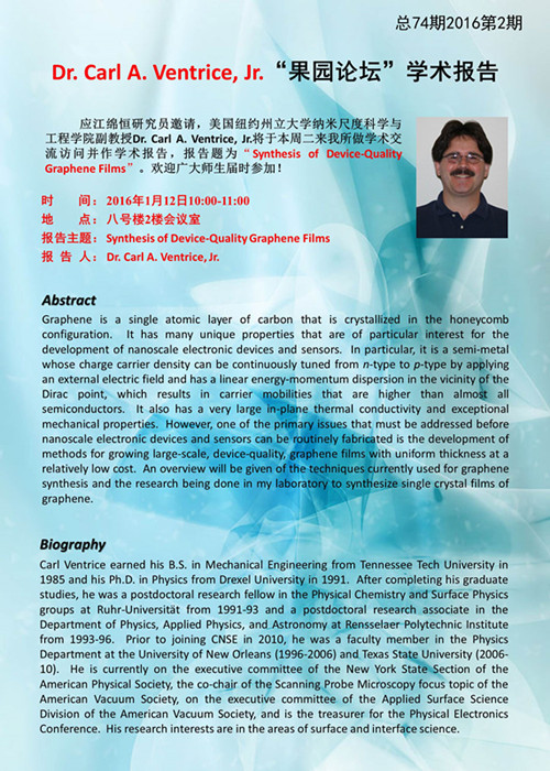 美国纽约州立大学纳米尺度科学与工程学院副教授Dr. Carl A. Ventrice, Jr.将于本周二来我所做学术交流访问并作学术报告,报告题为“Synthesis of Device-Quality Graphene Films”。