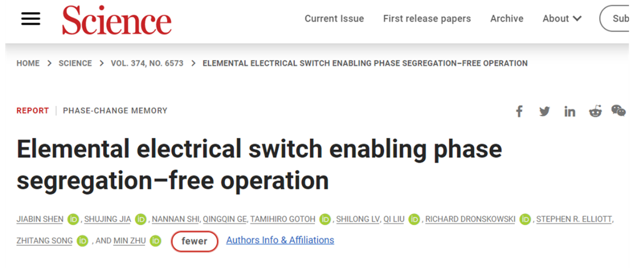 2021年12月10日,中科院上海微系统与信息技术研究所宋志棠、朱敏研究团队在国际顶级期刊《Science》上发表了题为“Elemental Electrical Switch Enabling Phase-Segregation-Free Operation”的研究论文(图1)。我所博士生沈佳斌、贾淑静为共同第一作者,宋志棠研究员、朱敏研究员为通讯作者,中科院上海微系统所为第一完成单位和唯一通信单位。