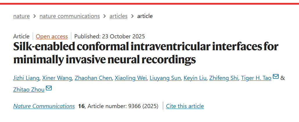 近日,上海微系统所传感器技术全国重点实验室周志涛研究员团队与上海脑虎科技有限公司陶虎研究员团队合作,开发出蚕丝蛋白赋能的微创植入式脑室内柔性神经界面,可在脑脊液环境中自展开,适形贴附于深脑核团及脑室等大脑“内表面”并长期在体监测,为深脑核团相关神经疾病的解析提供了一种全新的技术手段。相关研究成果以“Silk-enabled Conformal Intraventricular Interfaces for Minimally Invasive Neural Recordings”为题于2025年10月23日发表于国际学术期刊《自然•通讯》(Nature Communications)(DOI: 10.1038/s41467-025-64397-9)。