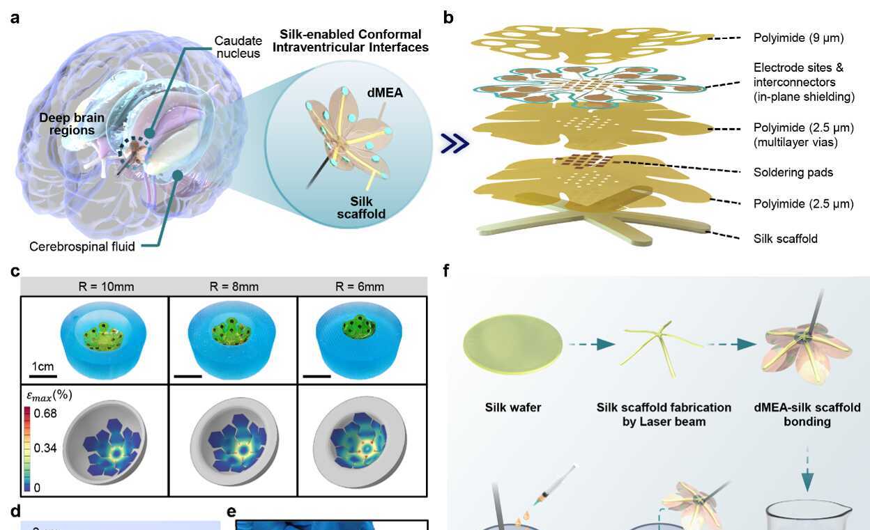 丝蛋白赋能微创植入式脑室内柔性神经界面总体概览:微创递送与自展开贴附示意、器件爆炸图、曲面适形有限元仿真与实物验证、系统实物、可变形微电极与丝蛋白支架,以及微创植入界面器件的集成