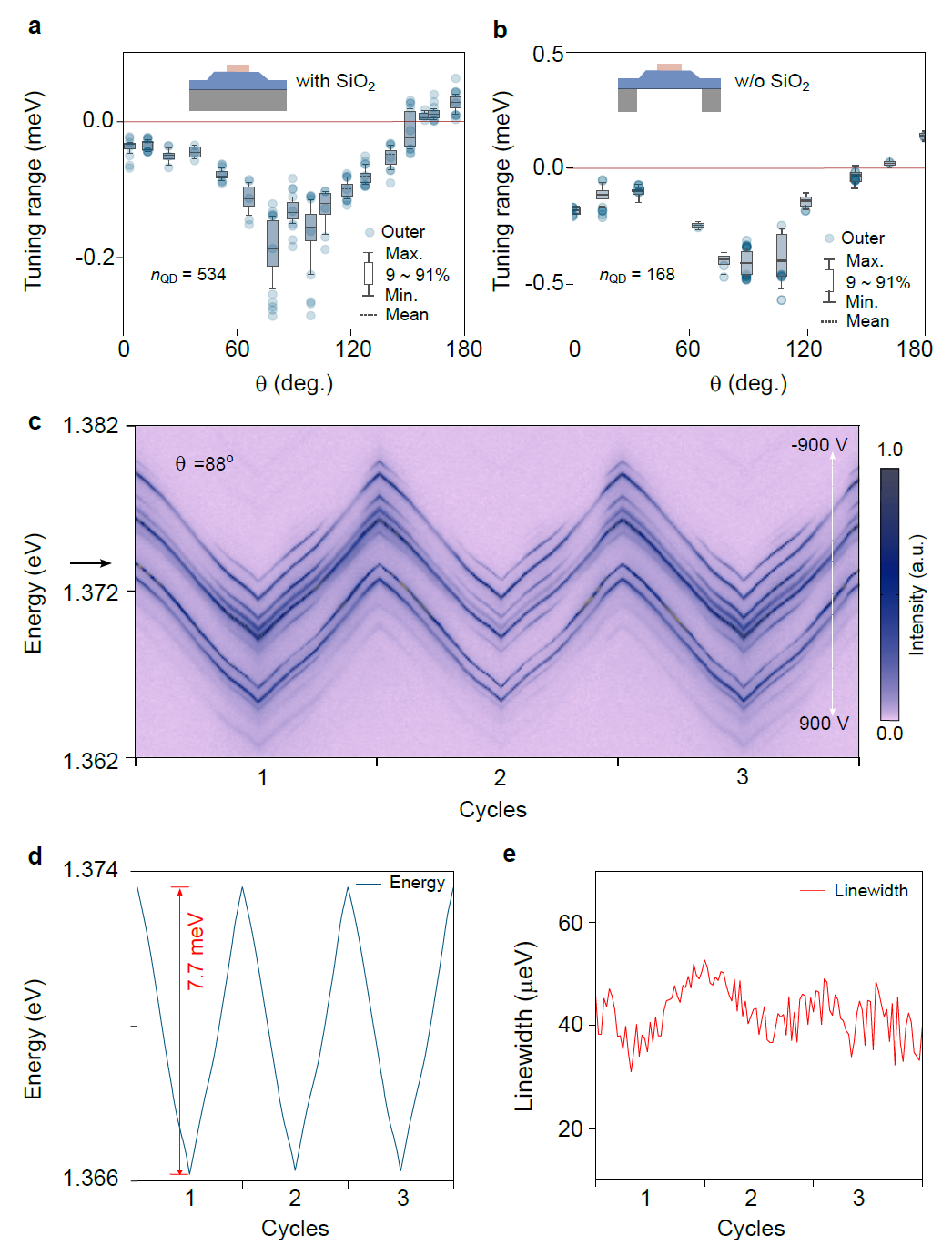 图3:波导取向相关的量子点局域应力调控范围统计,其中(a)为有二氧化硅绝缘层支撑的量子点/铌酸锂混合波导(b)为无二氧化硅绝缘层支撑的量子点/铌酸锂混合波导。(c)最优化角度(88o)处波导耦合量子点的可逆和大光谱范围调谐结果,调谐范围(d)7.7 meV。(e)局域应力调控量子点时单光子荧光线宽变化。