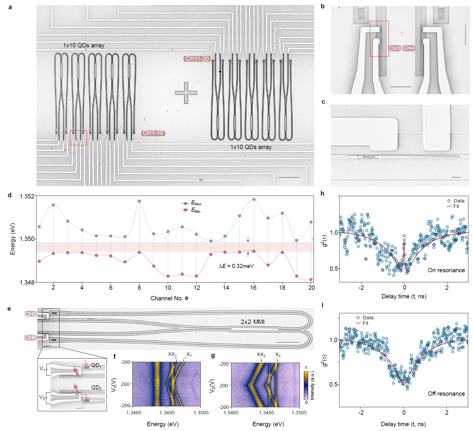 图4:(a)含20通道量子点确定性单光子源的铌酸锂混合集成光量子芯片。(b, c)量子点-铌酸锂混合集成波导扫描电子显微镜照片。(d)片上20通道量子点确定性光源的同时局域光谱调谐,局域调谐范围0.76 meV/400V, 红色区域为20通道量子光源调谐后的‘同频’区域。(e, f, g)通道5和6中两个不同频量子点的同时局域调控。(h,i)片上两个波导耦合量子点的双光子共振测试。