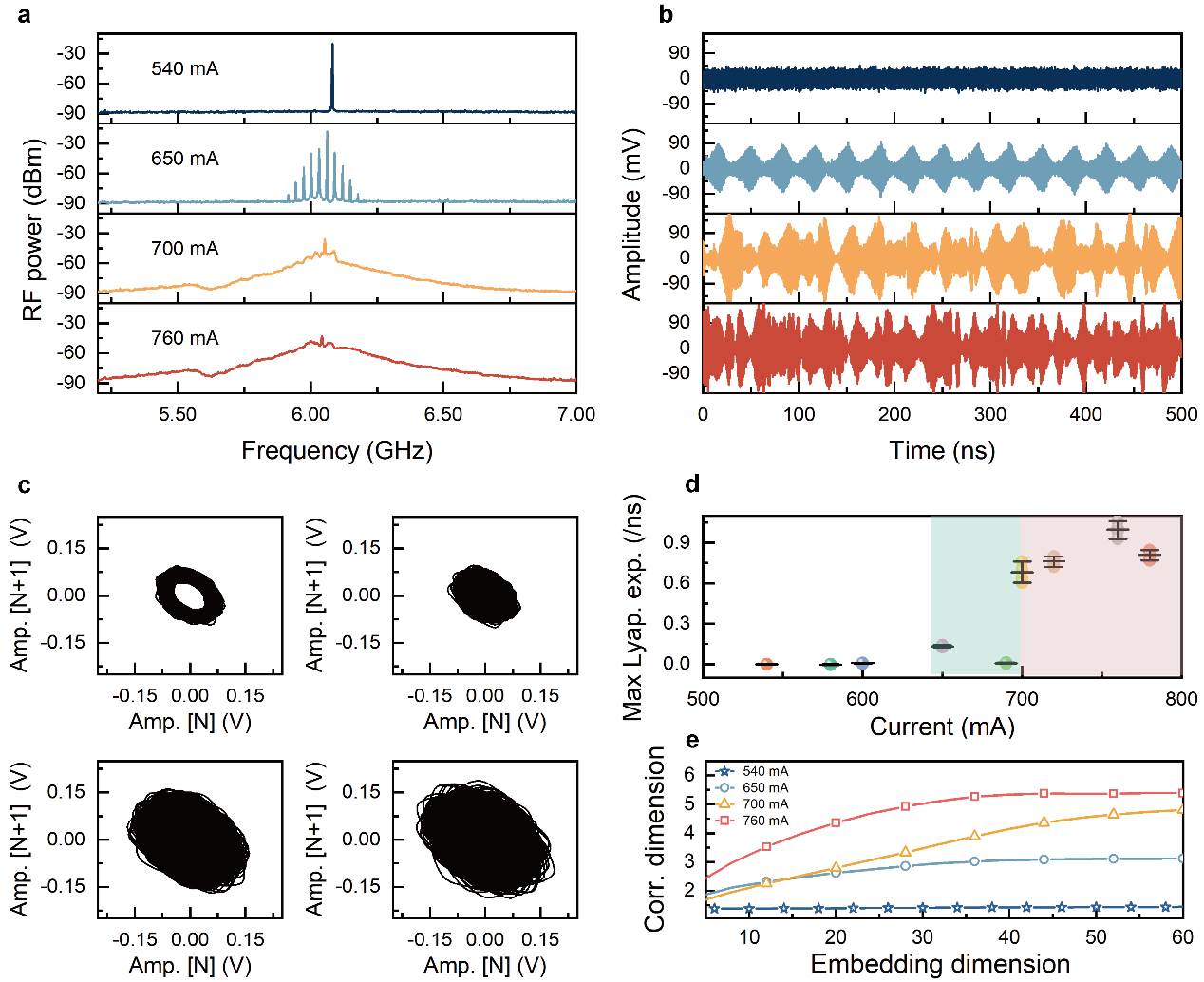 图1. 自由运行THz QCL混沌信号实验测量结果。实验展示了不同驱动电流下模间拍频信号的(a)频谱、(b)时域谱、(c)相图、(d)最大李亚普诺夫指数和(e)计算的关联维度。