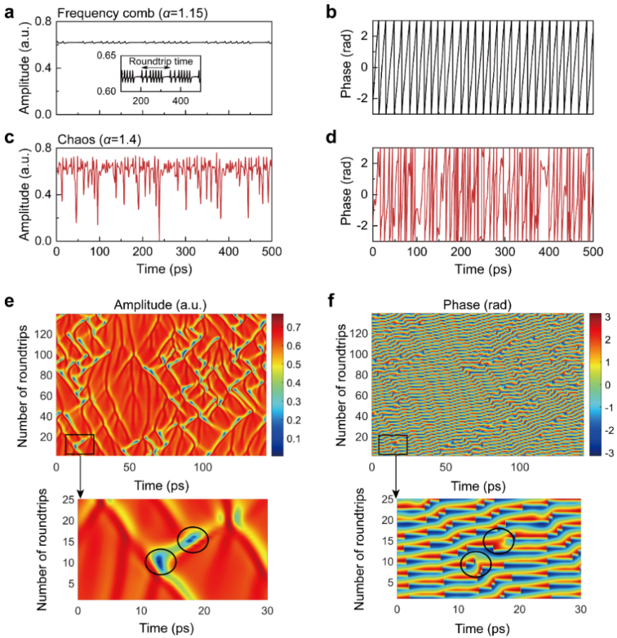 针对自由运行THz QCL的混沌产生机制,团队构建了基于Maxwell–Bloch方程的完整模型和基于复Ginzburg–Landau方程的简化模型开展研究。结果表明,α因子的增大可导致THz QCL从稳定态过渡至混沌态,而GVD的调控对混沌态频谱特性也有显著影响。进一步分析揭示了混沌形成的物理根源:在THz QCL以光频梳模式工作时,时域信号的幅值与相位呈周期性变化(图2a和2b);而当进入混沌态时,幅值与相位均表现出强烈的随机性和不规则性(图2c和2d)。最重要的是幅值为零的缺陷点出现,且这些缺陷点在非线性系统中传播,引发更多的随机相位与幅值波动,进一步产生新缺陷,最终导致系统演化为高度无序的混沌态(图2e和2f)。研究指出缺陷介导湍流(Defect-Mediated Turbulence)是自由运行THz QCL中产生混沌行为的内在物理机制。