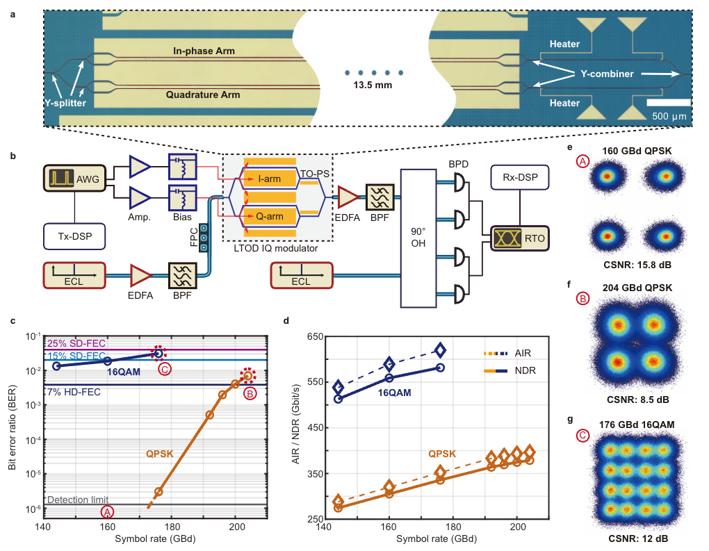 在高速信号传输实验中,研究团队使用PAM4 信号编码在 144–200 GBd 范围对强度调制器进行测试,并基于 GMI/NGMI 评估可实现的净数据传输速率,其中192 GBd PAM4 对应净速率最高 333 Gbit/s。进一步地,该异质平台也支持相干IQ调制,对应的相干光调制器由两条MZM 组成,通过热光移相器获得可长时间稳定的90° 相位差,并利用两个调制通道完成QPSK/16QAM等信号格式的传输演示,最终可实现的最高净速率达到 581 Gbit/s。上述指标刷新了同类平台的最高信号传输速率记录。
