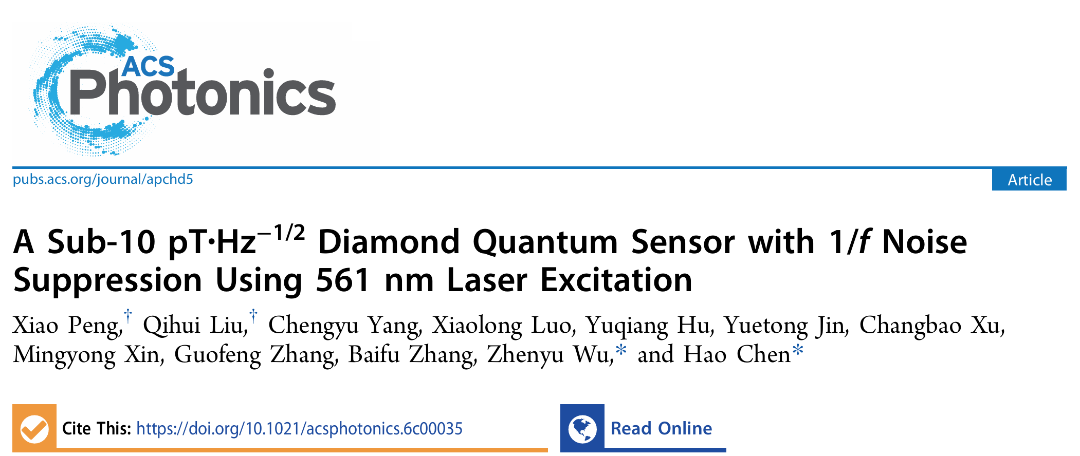 相关研究成果以“A Sub-10 pT·Hz-1/2 Diamond Quantum Sensor with 1/f Noise Suppression Using 561 nm Laser Excitation”为题发表于国际光学领域知名期刊ACS Photonics 。论文第一作者为博士研究生彭霄,通讯作者为武震宇研究员和陈浩研究员。该研究工作得到了国家重点研发计划、上海市战略前沿专项等支持。